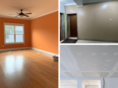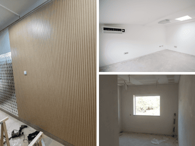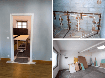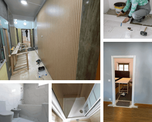 Atualização de espaços interiores, incluindo carpintarias, canalizações e revestimentos.
